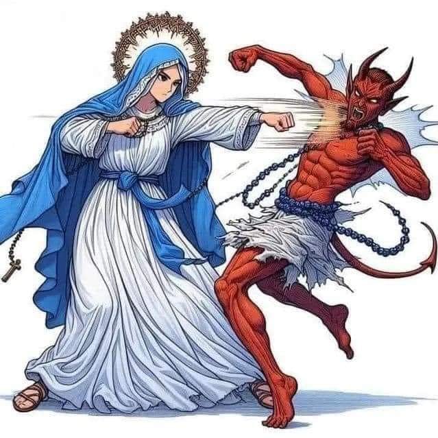 Anime art depicting Our Lady of the Miraculous Medal punching the devil | source